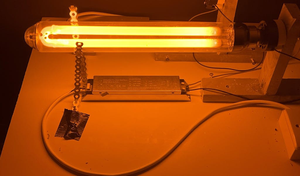 The SOX-55W LPS lamp casts my living room in an eerie yellow ambience. True monochromatic light. I cannot see in color when this lamp is running. It's a warm yellow and quite bright, but seeing everything in yellow-scale creates an unsettling atmosphere. Invocative of the night life. I feel myself metamorphosizing into a moth when this lamp is running. Vibes are strange. Just as I hoped.